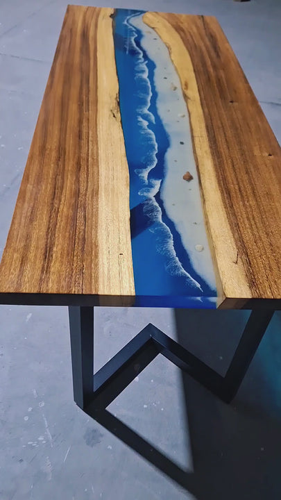 Deze luxueuze epoxy riviertafel van 200 × 80 cm combineert natuur, vakmanschap en modern design op een unieke manier. Het tafelblad bestaat uit twee massieve houten schaaldelen, waarbij de natuurlijke live-edge vormen volledig behouden blijven. Tussen de twee prachtige houten stukken stroomt een helderblauwe epoxy “rivier”, afgewerkt met een realistisch stranddeel, dat samen een spectaculair oceaan-effect creëert.
