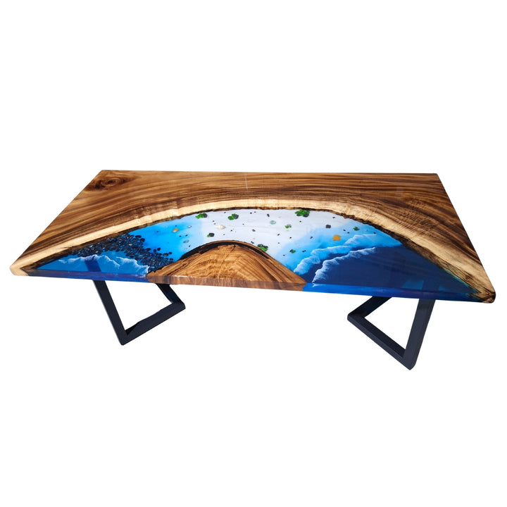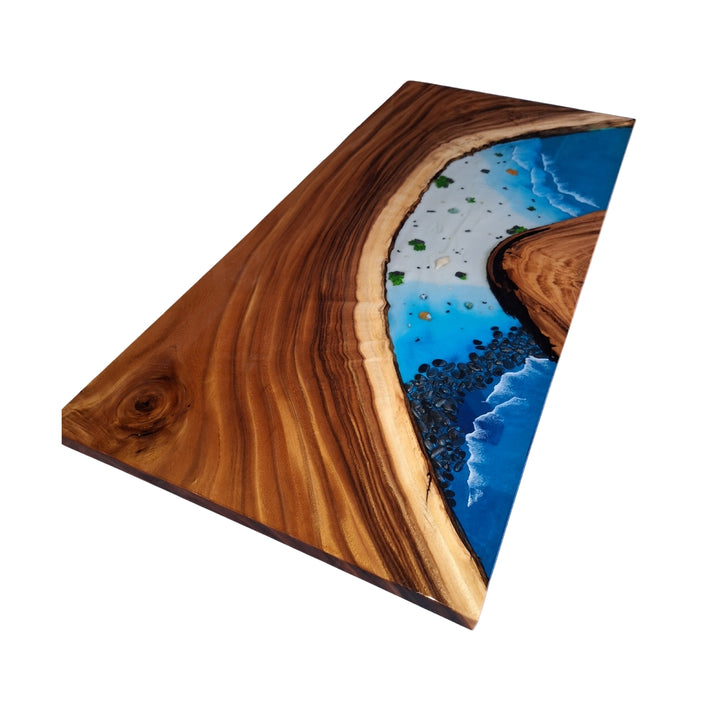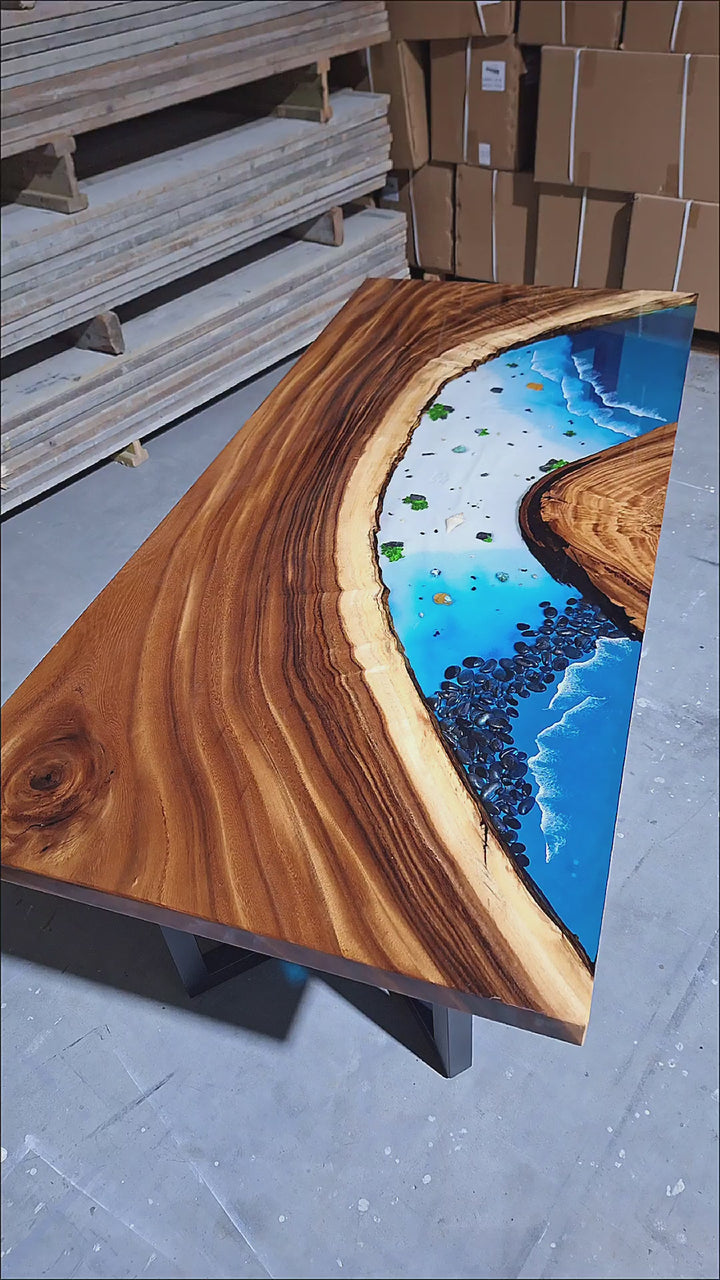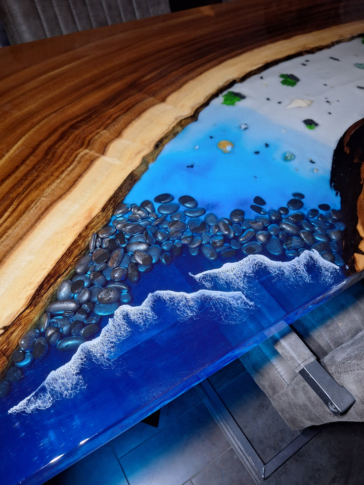 epoxy tafel, epoxy riviertafel, ocean epoxy tafel, epoxy eettafel, notenhouten tafel, river table, epoxy strand tafel, blauwe epoxy tafel, epoxy hout tafel, handgemaakte houten tafel, luxe design tafel, massief houten epoxy tafel.