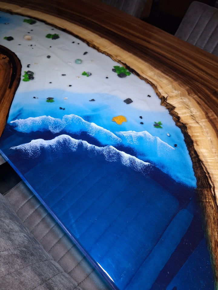 Het warme, diepe bruin van het Amerikaans notenhout contrasteert schitterend met de helderblauwe epoxy, die in meerdere lagen is gegoten voor een kristalheldere en natuurgetrouwe uitstraling. Het stranddeel bevat subtiele zandstructuren en decoratieve details, waardoor de tafel je direct meeneemt naar een tropische kustlijn. Dankzij de hoogwaardige afwerking is deze tafel niet alleen een kunstwerk, maar ook duurzaam, krasvast en onderhoudsvriendelijk.
