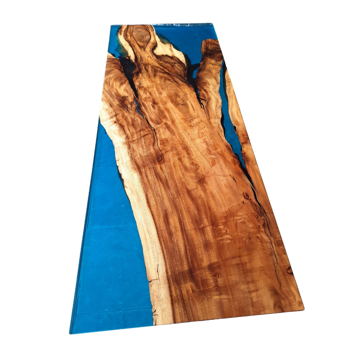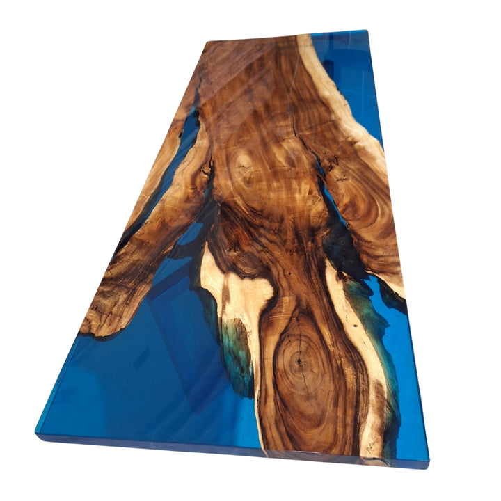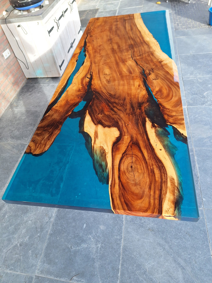 Breng stijl en exclusiviteit in jouw interieur met deze handgemaakte epoxy tafel van Zuid-Amerikaans notenhout. Met een royale afmeting van 230x90x5 cm en een schitterende blauwe epoxy inleg, is dit dé eyecatcher voor jouw eetkamer of kantoor.