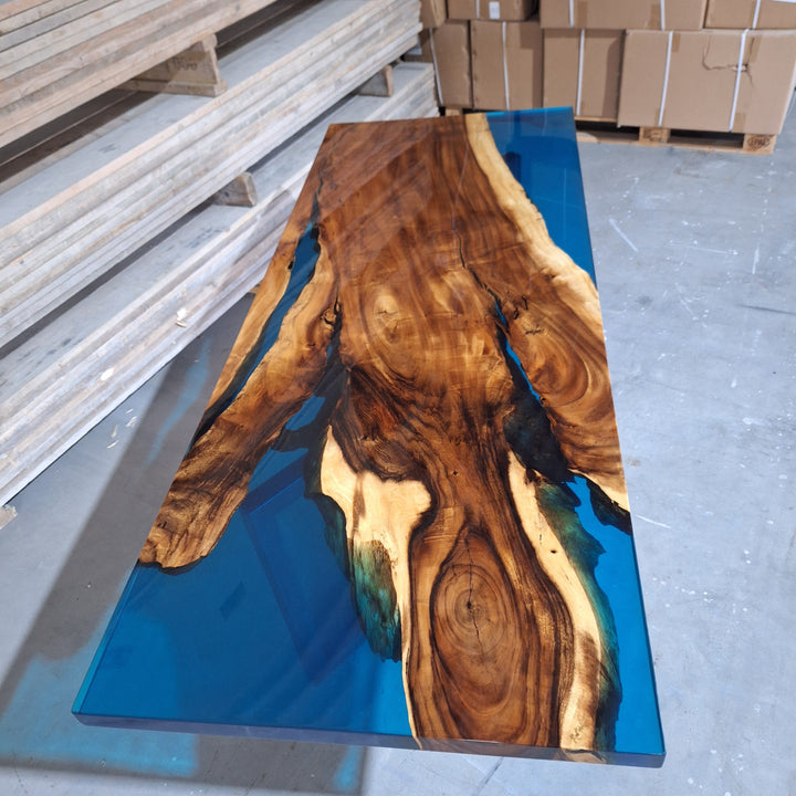 Epoxy Tafel 230x90x5 cm – Luxe Notenhout met Blauwe Epoxy